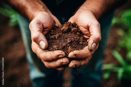 Agronomist holding soil clod, close up of male hand with sample from agricultural field