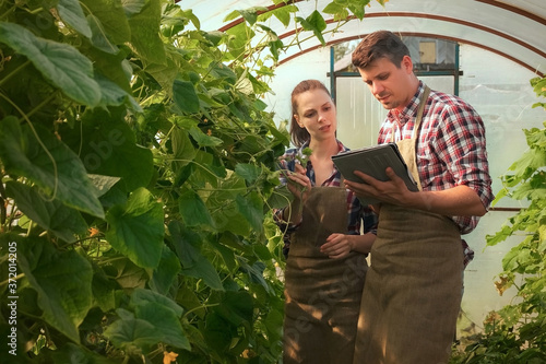 Agronomists woman and man conducts inspection of growing cucumbers in greenhouse and put indicators in tablet. Agribusiness concept. Control of technology of cultivation agricultural plants.