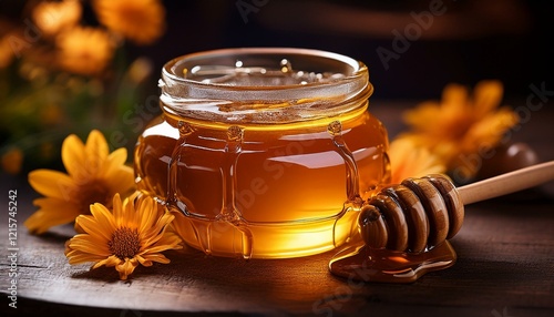 新鮮で健康的な瓶に入ったはちみつ。AIで生成