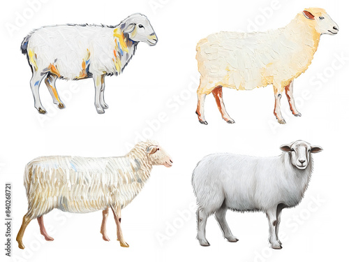 アナログタッチ、手描き風の羊、ひつじのイラストセット 未年 年賀状素材 AI生成画像