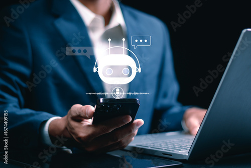 AI Artificial Intelligence,Digital chatbot, Man chatting with digital assistant chatbot on mobilephone on internet application,Future of customer service man utilizes AI chatbot for instant assistance