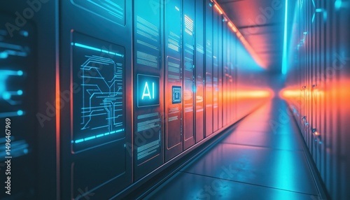 AI Automation Data Center Glowing Servers, Futuristic Design, Digital Future Technology