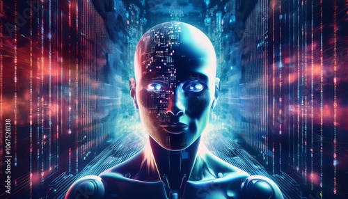 AI Awakening: A mesmerizing portrait of a digital humanoid, its face a mosaic of circuitry and glowing light, surrounded by a dynamic burst of binary code.