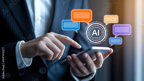 AI chatbot, smartphone chat, digital speech bubbles, LLM, large language model, AI assistant, virtual assistant, person using chatbot, mobile AI, smart assistant, chat interface, talking to AI,