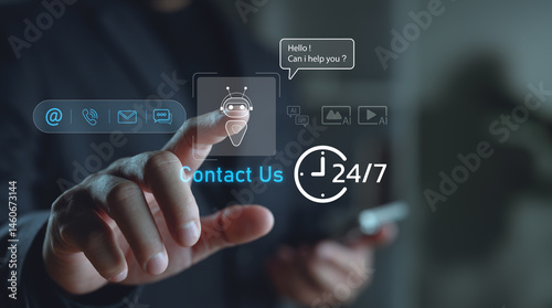 AI chatbot support and 24/7 virtual assistant concept with futuristic contact icons, representing customer service automation, online helpdesk, live chat support, and digital communication tools.