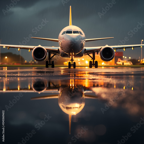 ai creates generative images,airplane picture Parked on the airport, rain falling, water reflection