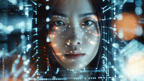 AI Cyber Security Threat, Female Asian IT Specialist Analyzing Futuristic Holographic Data Information. Blue & Orange Colors, Augmented Reality Artificial Intelligence Concept