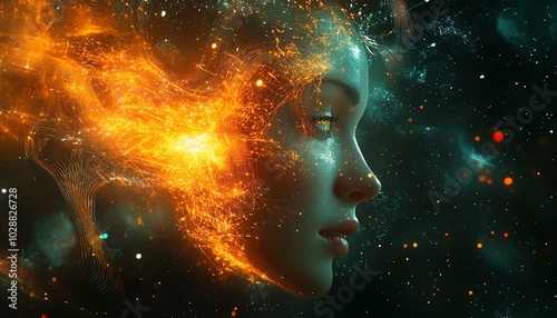 AI entity emerging from a cosmic digital realm, surrounded by luminous circuits and neural network tendrils, abstract data streams in a futuristic holographic setup