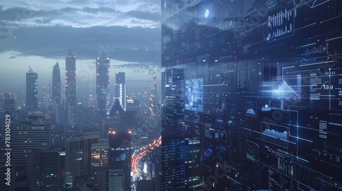 AI Ethics and Governance. Screens hover over city showing AI ethics for equitable tech