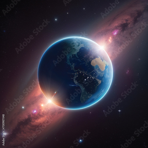 Ai generate A distant galaxy filled with small colorful stars, and meteorites, a blue Earth-like planet in the foreground, realistic, colorful, 4k, awesome