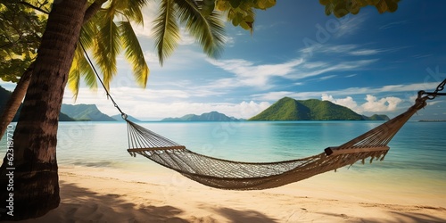 AI Generated. AI Generative. Beach island sand ocean sea vacation relax chill adventure dream sleep shadow hammock with palms. Graphic Art