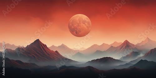 AI Generated. AI Generative. Minimalistic nature outdoor landscape with mountains hills and full moon in red vintage retro style. Graphic Art