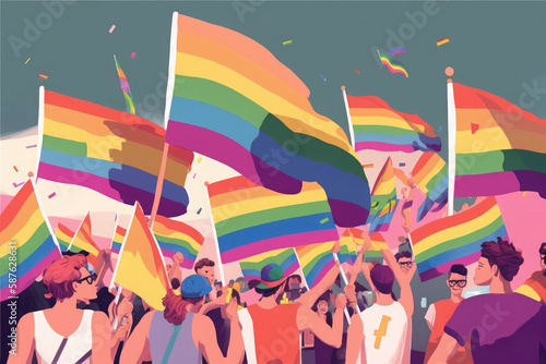 AI generated closeup rainbow flags of LGBT community blowing in wind at street of gay parade