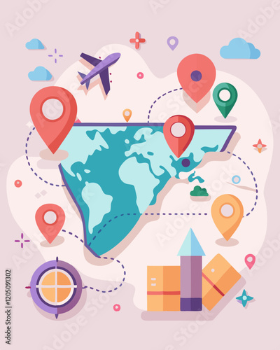 AI Generated flat vector map with location pins, planes, and travel icons in soft pastel colors.