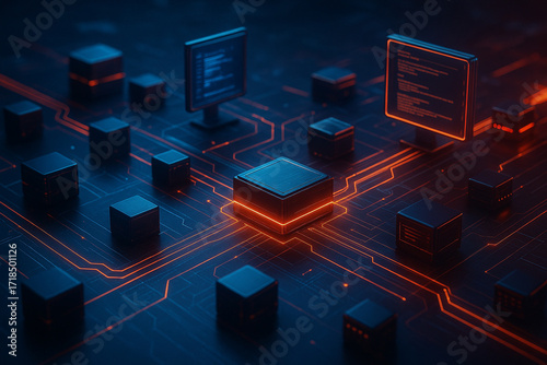 AI generated glowing server blocks and circuit connections symbolizing digital network data processing cybersecurity technology and advanced infrastructure communication