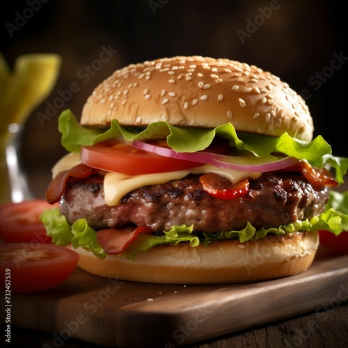 AI generated illustration of a cheeseburger stacked with crisp lettuce and other assorted toppings