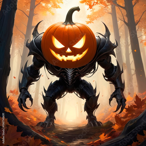 AI generated illustration of scary character with pumpkin head in forest at night.