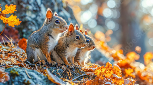 AI generated illustration of squirrels standing in a natural outdoor setting, with concentrated look