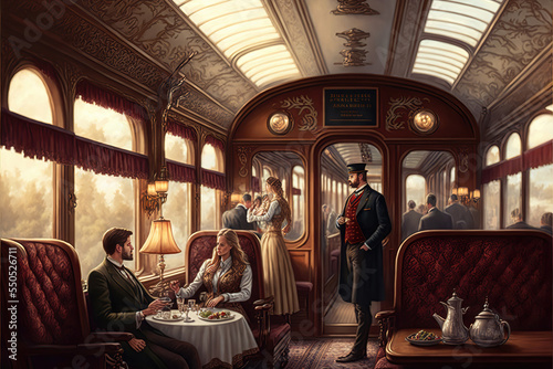 AI generated image of a very grand and ornate dining car in a Victorian era train, with passengers, waiters and staff. Oriental Express