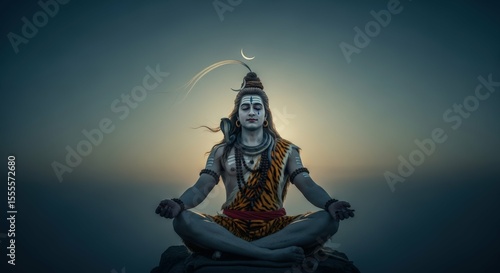 Ai generated image of lord shiva meditates peacefully at sunrise, a crescent moon above him