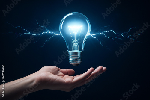 AI generated of human hand holding glowing blue white light bulb floating above palm with electric sparks radiating outward against dark background symbolizing creativity innovation and inspiration