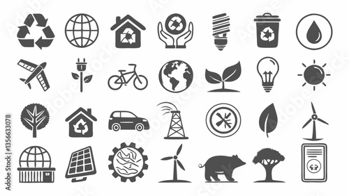 AI Generated set of environmental icons including recycling, electric car, solar panel, wind turbine, tree, water drop, plant, eco house perfect for sustainability, conservation, clean energy visuals