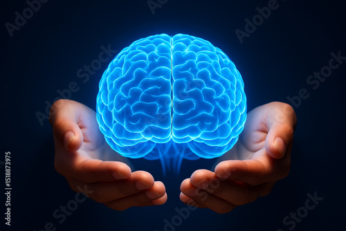 AI generated symbolic science concept of glowing blue brain gently held by two human hands over deep blue background expressing protection wisdom and value of intelligence