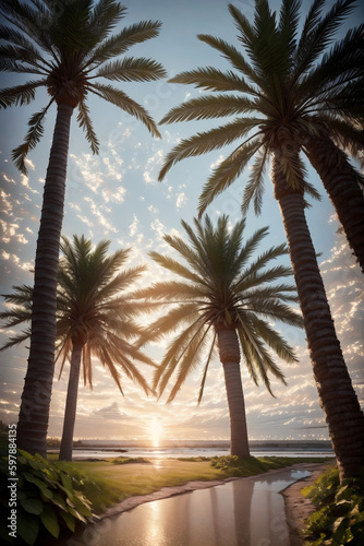 AIで生成した夕焼けに巨大なヤシの木を見上げるイラスト ジェネレーティブ Generative AI