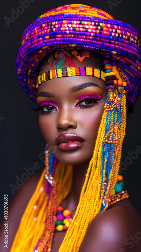 AI generator image of Beautiful full body with South African Woman, fashion colorful Face makeup, Beautiful Skin, Fashion Catwalk, Portrait