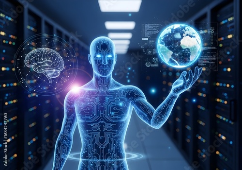 AI Humanoid Hologram Holding Earth Globe and Brain in Server Room, Artificial Intelligence Concept