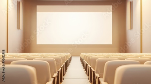 AI illustration of a theater with rows of cream-colored seats and a blank white screen. No people, no logos.