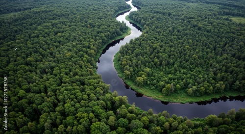 AI image captures an aerial view of a winding river snaking through a dense, lush green forest, showcasing the beauty of nature's landscape.