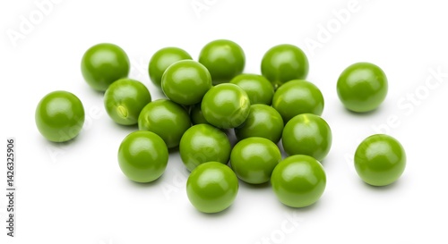 AI image displays a small, loose pile of vibrant green peas scattered naturally across a clean, bright, isolated white studio background.