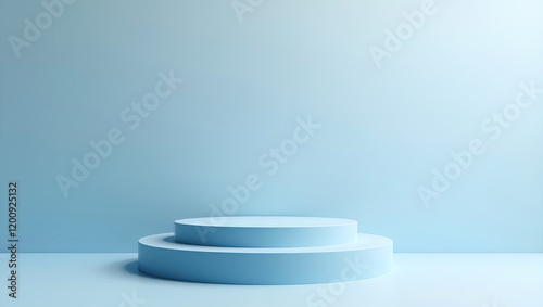 AI image of a minimalist light blue scene featuring a two-tiered circular pedestal against a plain, softly lit background.
