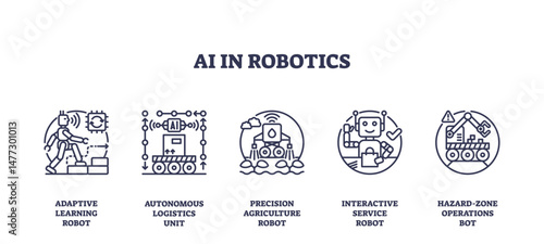 AI in robotics features outline icons of adaptive robots, logistics units, and service bots, symbolizing automation and smart technology. Outline icons set