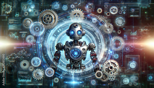 AI Robot Background A mechanical robot surrounded by floating gears and holographic displays in a cyber-tech background3