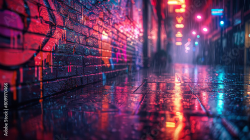 AI technology can create realistic images of a rainy urban street at night, complete with vibrant lights and graffiti-adorned walls.