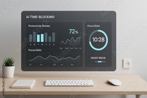 AI Time-Blocking Dashboard Showing Productivity Streaks, Focus Ratio Graph, and Smart Break Timer in Minimalist Desk Setup