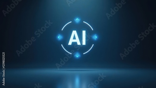 Ai Video Editing. Artificial intelligence glowing blue AI text futuristic digital concept technology background for innovation, business, and science, dark minimalistic space with reflections and neo