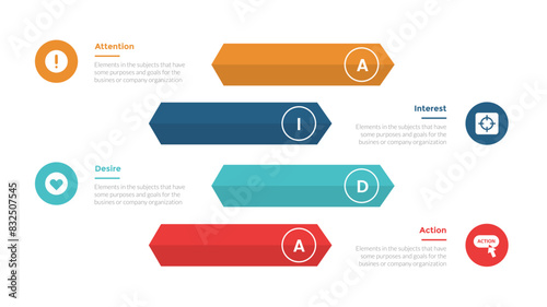 AIDA marketing funnel infographics template diagram with arrow rectangle stack with 4 point step design for slide presentation