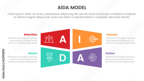 aida model for attention interest desire action infographic concept with square block center modification 4 points for slide presentation style vector