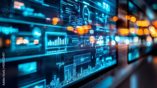 AI-enhanced security systems, holographic surveillance, modern smart city