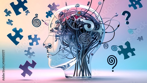 AI-Generated Concept of a Transparent Head with Neural Wires and Question Marks Representing Cognitive Confusion