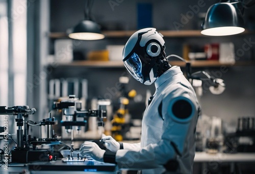AI-generated illustration of a robot working in a laboratory with a blurry background