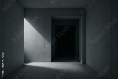 AI-generated minimalist concrete hallway with dramatic lighting and shadows