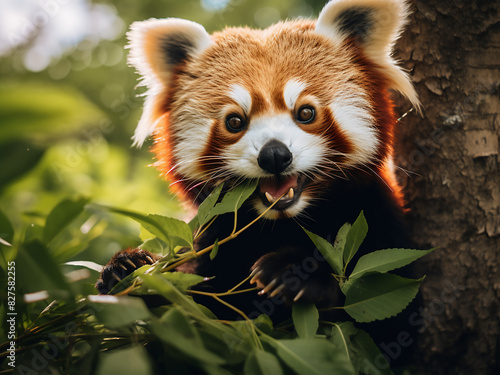 Ailurus fulgens, the red panda, enjoys a bamboo feast