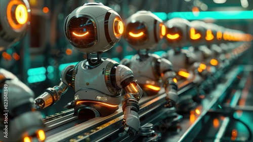 AIpowered industrial robots, assembly line, glowing data streams, vibrant colors, photorealistic, machine learning,