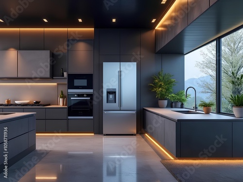 AI-powered kitchen smart home interior with futuristic appliances, clean lines, and ambient mood lighting