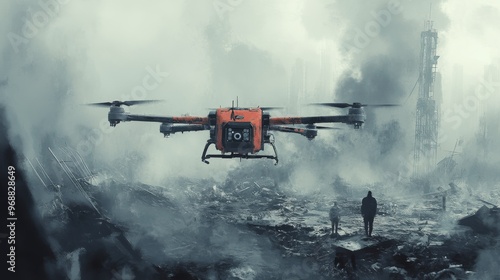 AI-powered search and rescue operations in disaster zones: Drones and robots navigating through a disaster area to locate survivors.