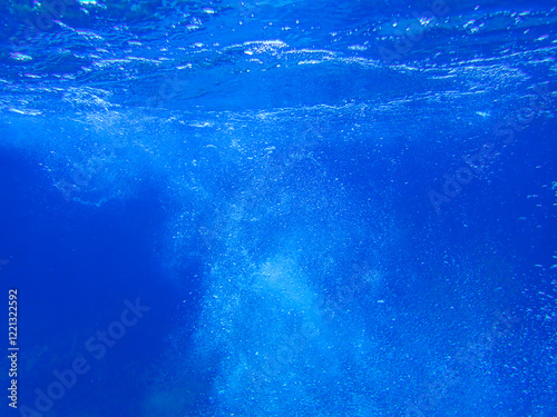 Air bubbles underwater rising to water surface, natural scene, bubbles under water, bubble undersea, sea in crystal clear green water. Real image very suitable for backgrounds, Great for background.